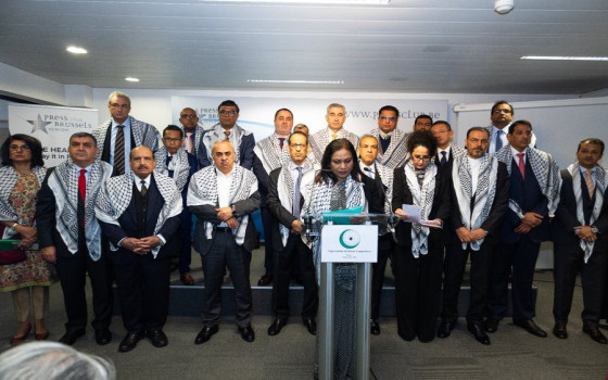 بروكسل : اوروبا والعرب ظهر سفراء دول منظمة التعاون الاسلامي لدى الاتحاد الاوروبي وهم يحملون على اكتافهم " الرمزي الفلسطيني " الشال " وذلك خلال مؤتمر...