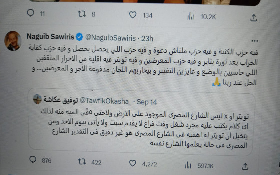 القاهرة ـ بروكسل : اوروبا والعرب كتب رجل الاعمال المصري نجيب ساويرس على موقع اكس " تويتر سابقا " وقال " فيه حزب الكنبة و فيه حزب ملناش...