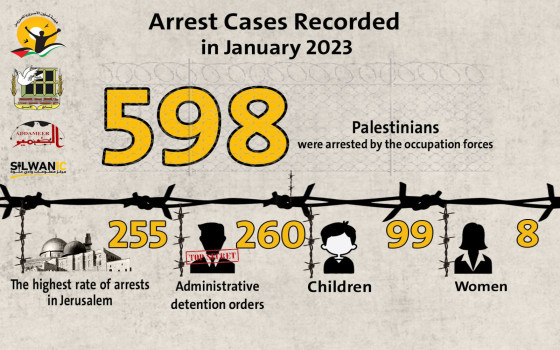يذكر أنه تم إصدار (260) أمر اعتقال إداري بتاريخ يناير 2023 ، منها (103) أمرًا جديدًا و (157) أمرًا بالتجديد.