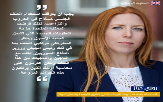 وكتبت المتحدثة البريطانية تقول" نقف مع الناجين والناجيات من هذا العنف ونحن عازمون على محاسبة اولئك الذين يرتكبون هذه  الجرائم  "