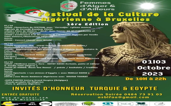 أعلنت  فايزه عثماني رئيسة جمعية " النساء الجزائريات واخريات "في بروكسل عن تنظيم النسخة الاولى من المهرجان الثقافي الجزائري في مطلع اكتوبر وعلى مدار ثلاثة ايام في بروكسل عاصمة بلجيكا الاتحاد الاوروبي