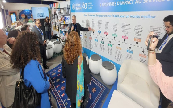 "ثمانية عقود من الأثر الإيجابي في خدمة الإنسانية" عنوان لوحة حائطية توسطت جناح منظومة الأمم المتحدة في المغرب في معرض الرباط الدولي للكتاب والنشر لعام 2025.